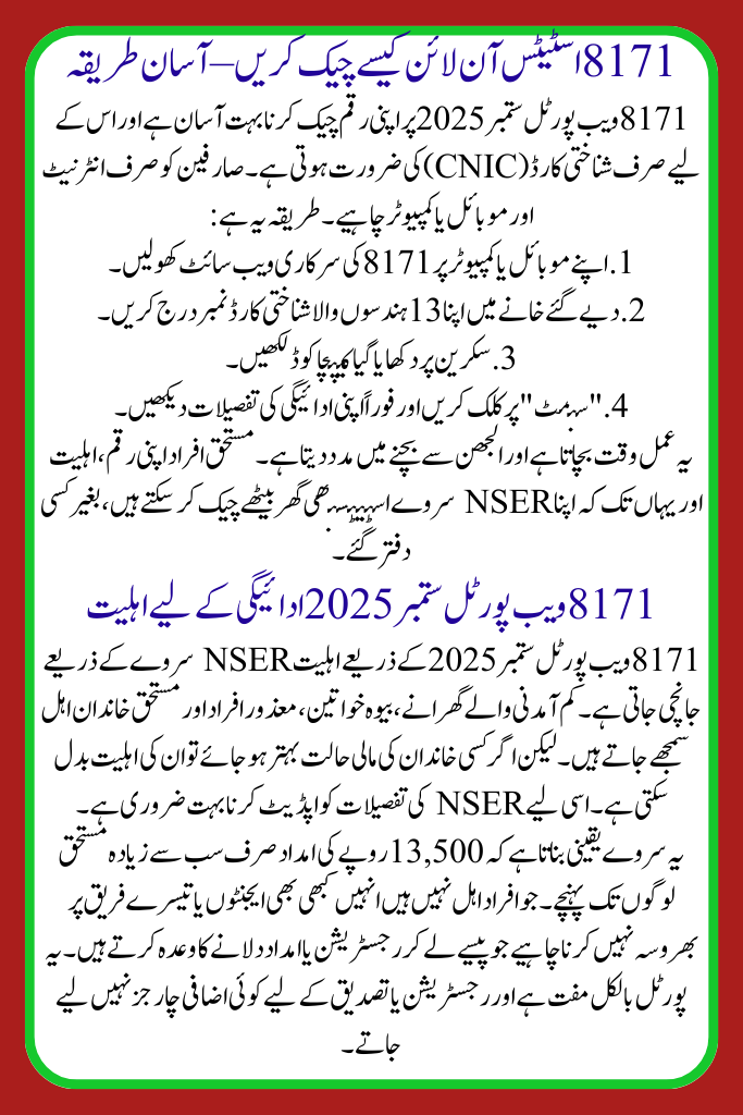 If somebody does not have internet admission, the 8171 Web Portal September 2025 for CNIC Check also ropes SMS checking. By sending the CNIC number to 8171, hopefuls will receive a reply with their eligibility and sum facts. It is vital to trust only SMS messages sent directly from 8171.