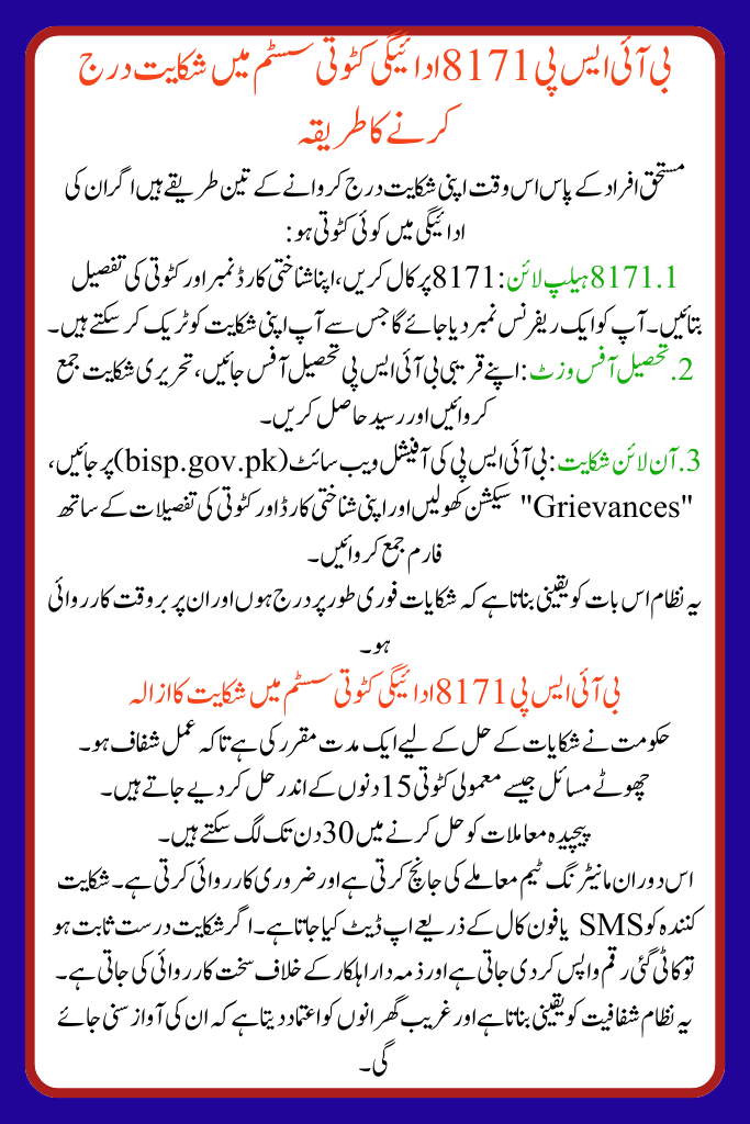 • Online Complaint: Visit the official BISP website (bisp.gov.pk), go to the “Grievances” section, and submit the online form with your CNIC then deal particulars.