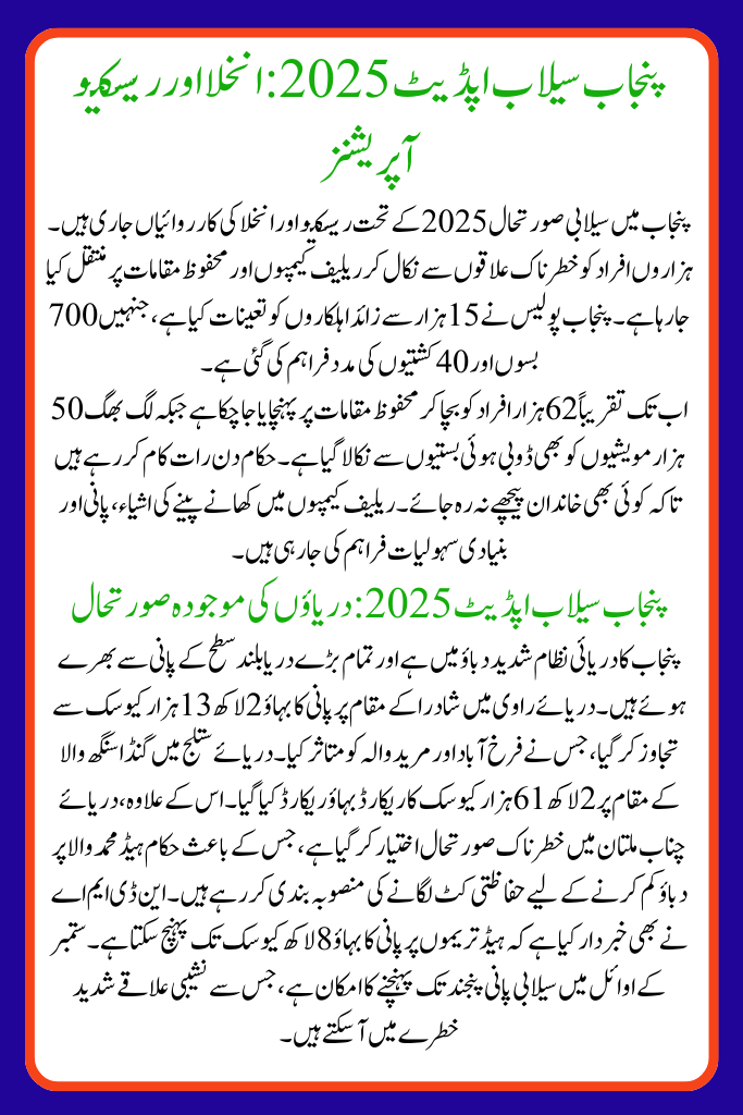 In this article, we are sharing all the details about the Punjab flood Inform 2025, including evacuation work, river status, safety rules, and government actions. So far, thousands of people and creatures have be situated released, but the condition is still serious. The NDMA, Punjab Police, and rescue teams are working with full energy to save lives and reduce damage. Populaces are strongly advised to follow safety measures, shift to secure areas, and avoid risky places near rivers. With communication and caution, Punjab can overawed this difficult test in the pending days.